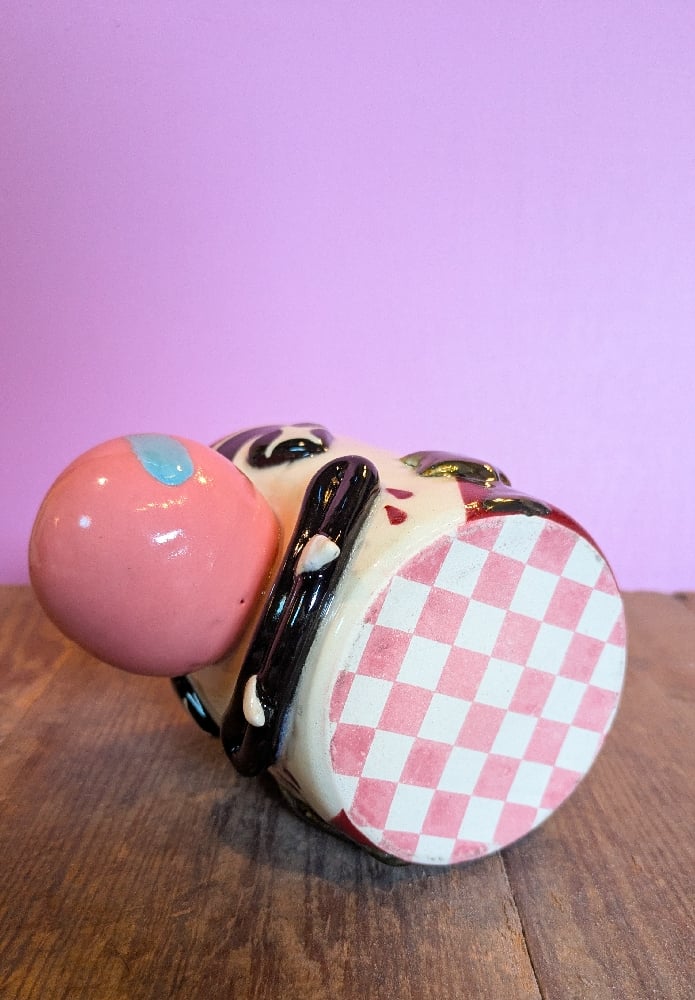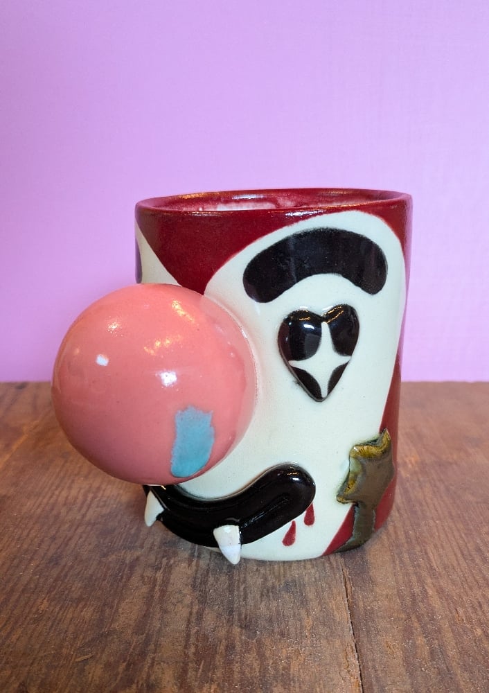 ☆ this clown-t dracula came out with a blue glaze beauty mark on its nose, which is a glaze drip from another mug in the kiln. it also had a broken tooth, which I repaired and sealed with glaze before firing, so the repaired tooth is slightly discolored from the other!