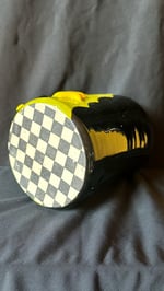 All mugs have black and white checker board pattern on the bottom and dark purple inner glaze.