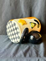 All mugs have black and white checker board pattern on the bottom and a black inner glaze.